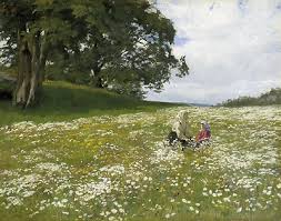 Og breden låg så byrg og blå til fjells til fjells ein måtte gå. Og folket ville alle vel, ein gjekk ikring så trygg og sæl.